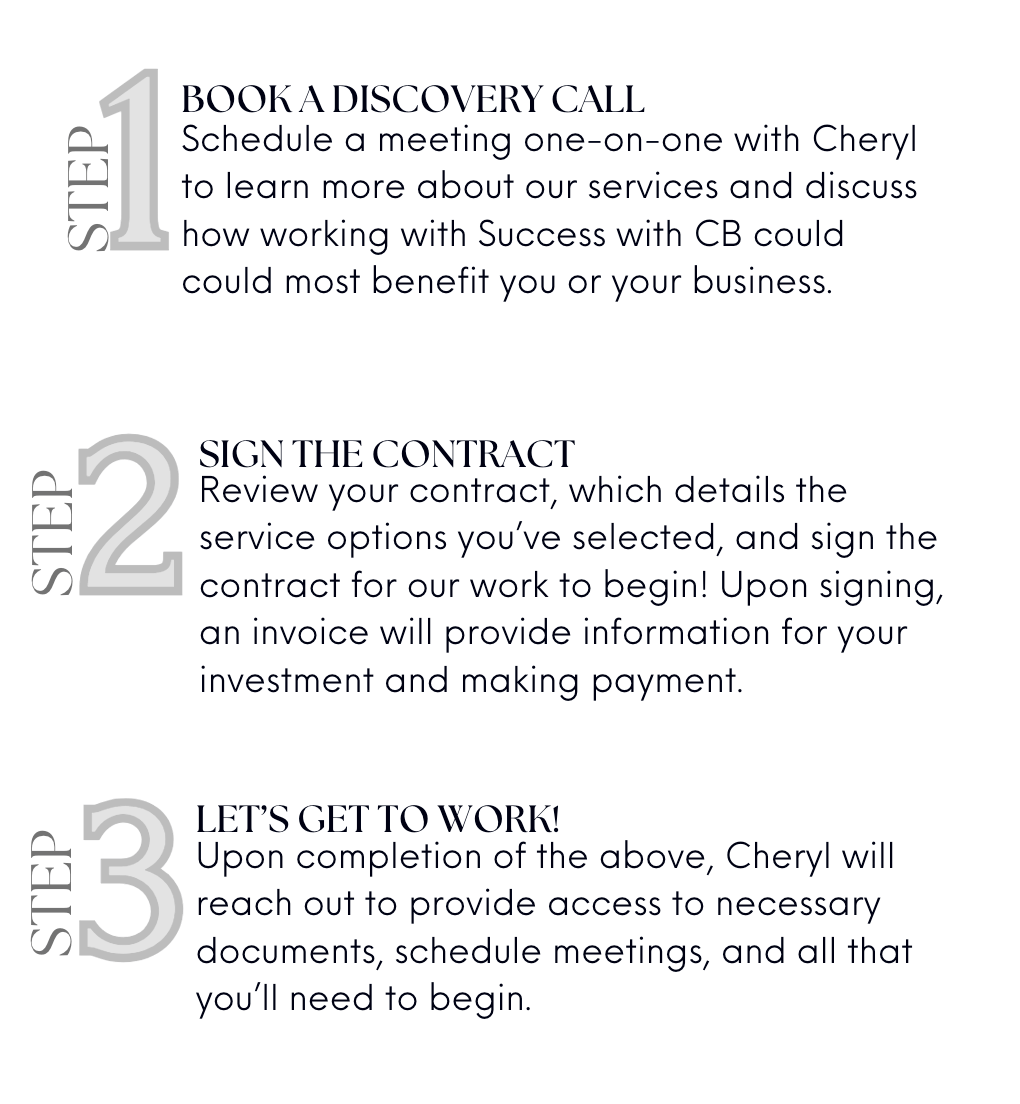 Our services can be offered à la carte or packaged dependent on your needs. While our specific work will be discussed during your discovery call, the below provides a snapshot of just some of what Success with CB has to offer!